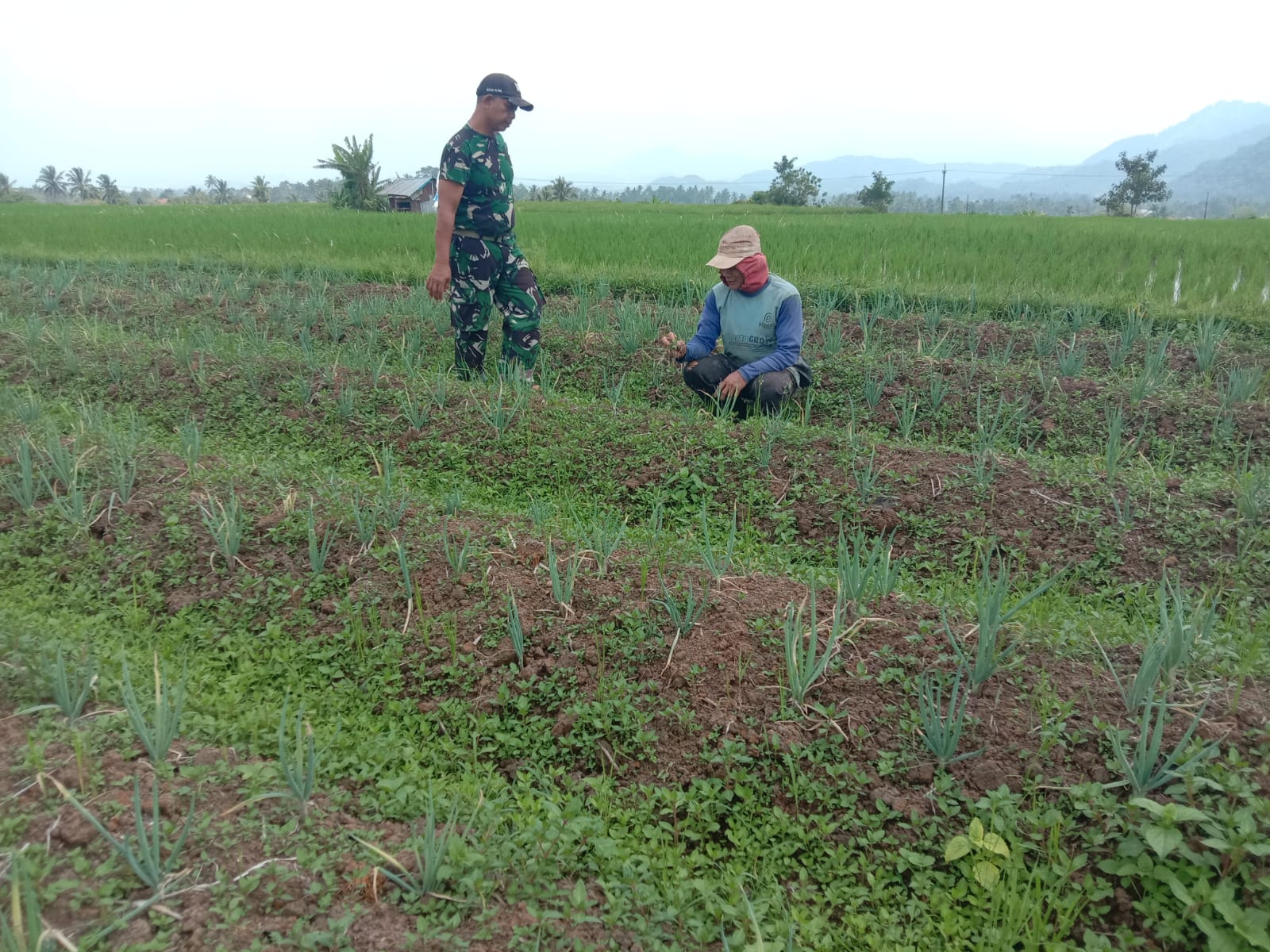 Disamping membersihkan tanaman bawang daun milik sendiri Serda Elvi Sadrianto juga membantu petani lain Bapak Rustam membersihkan gulma yang tumbuh disekitar tanaman bawang daunnya.